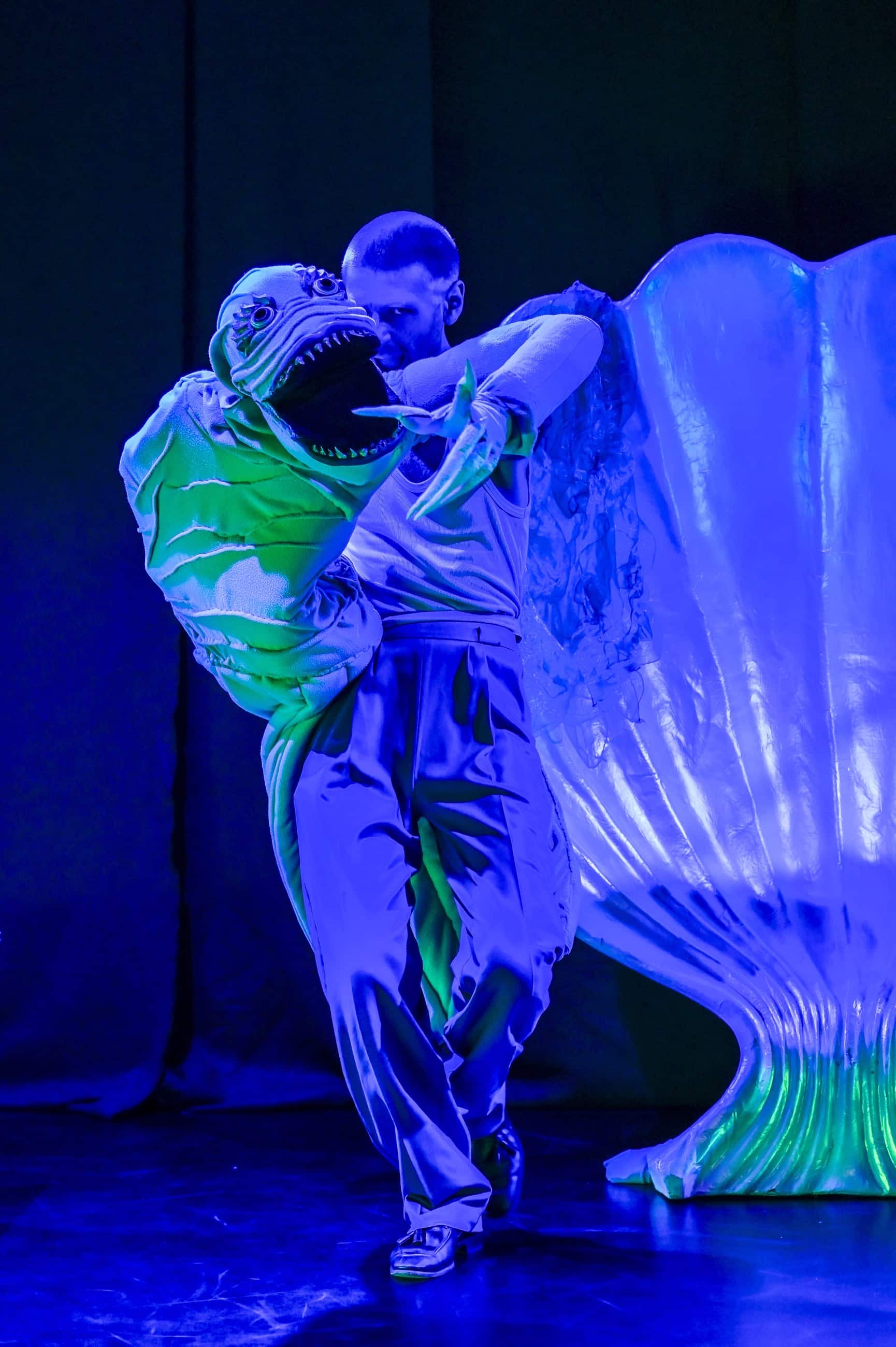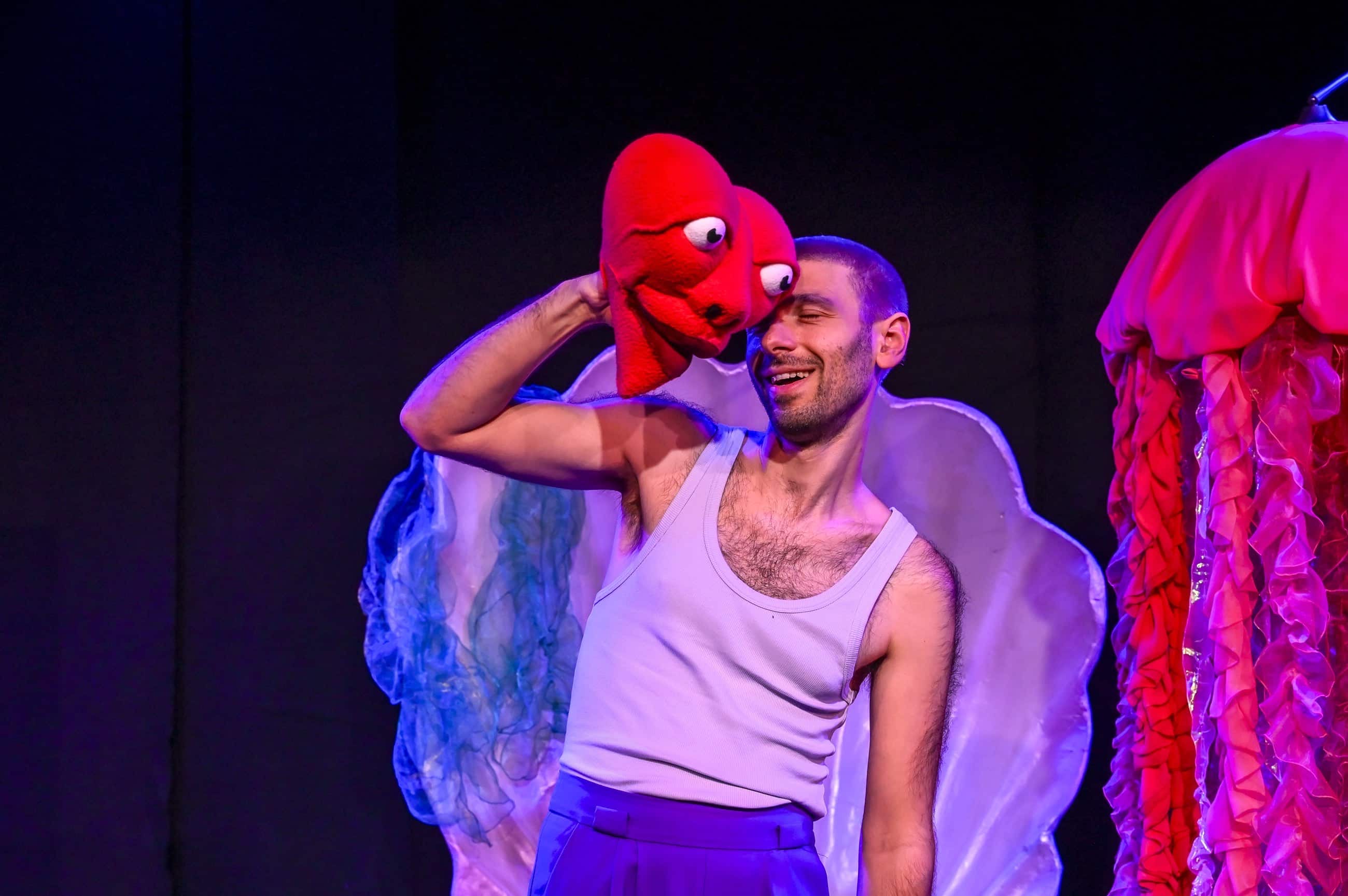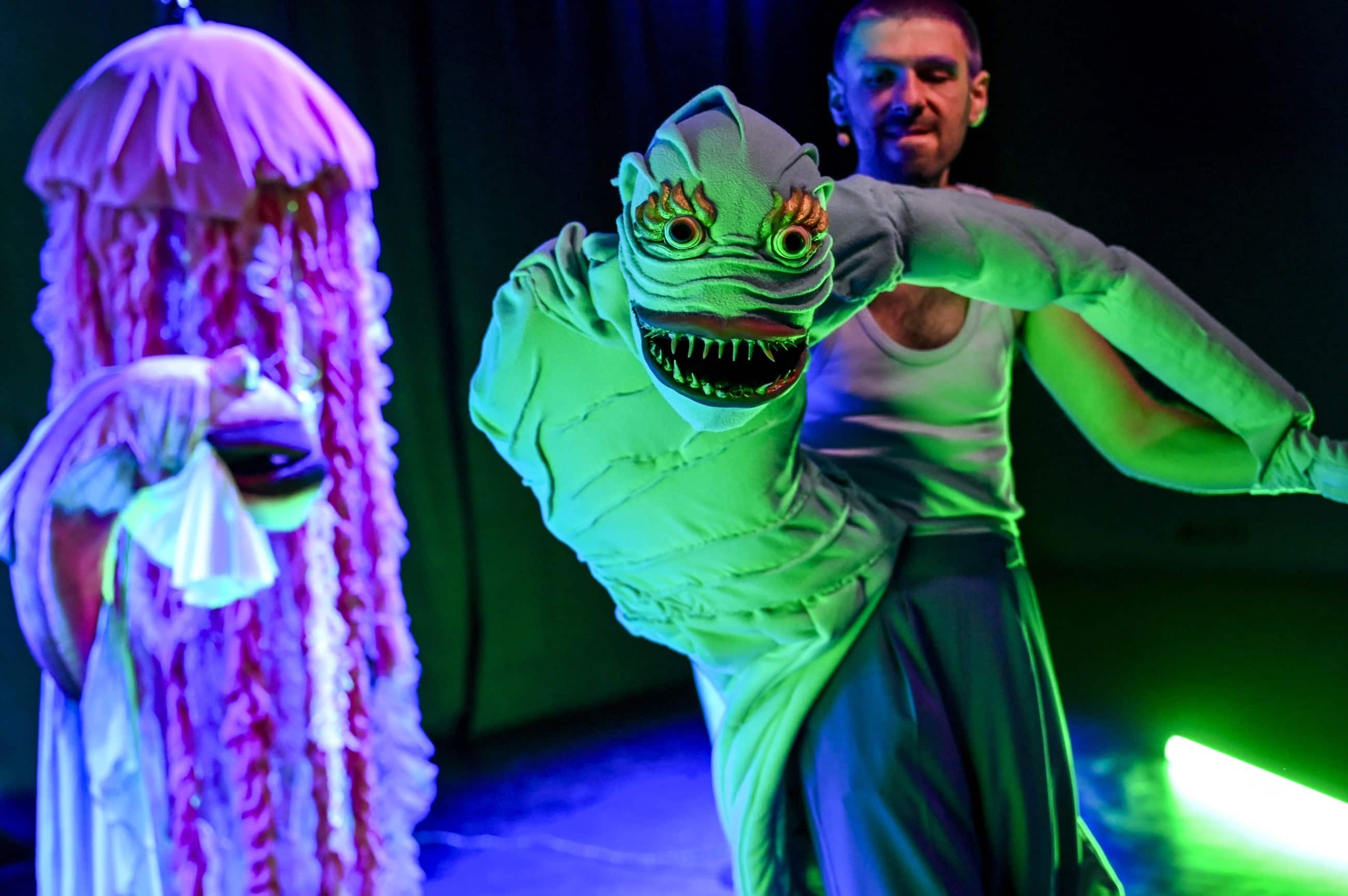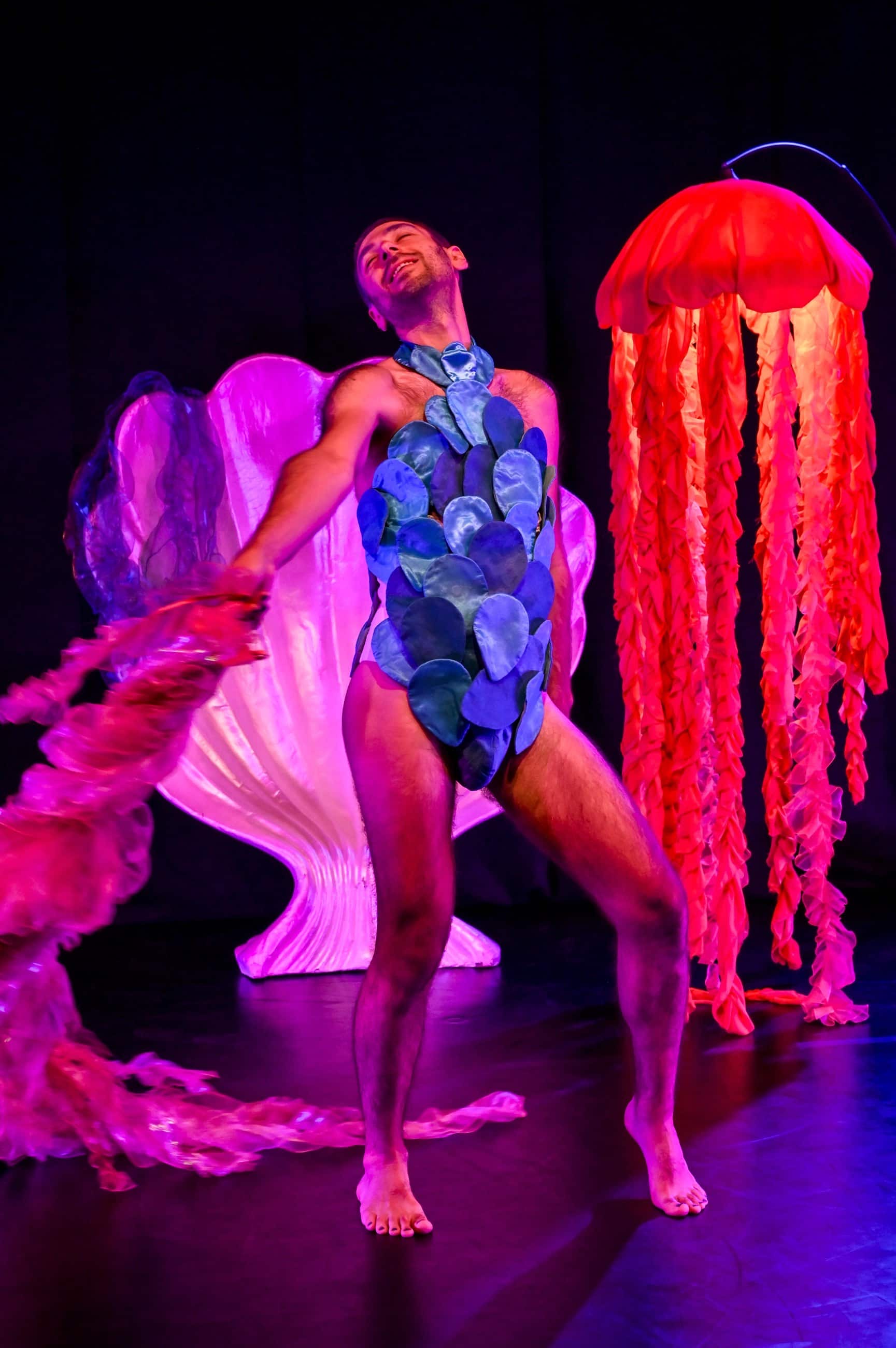 FischHerz will diese Themen verhandeln im Mantel einer glamourösen Puppenshow. Ein Märchen für Erwachsene im Spannungsfeld zwischen großen Themen und albernem Klamauk. Unser Begehren zieht uns ins Meer, wir tauchen ab in eine magische Welt und begegnen schillernden und gruseligen Meeresbewohnerinnen, doch können wir am Meeresgrund finden, was wir suchen, und was suchen wir überhaupt?